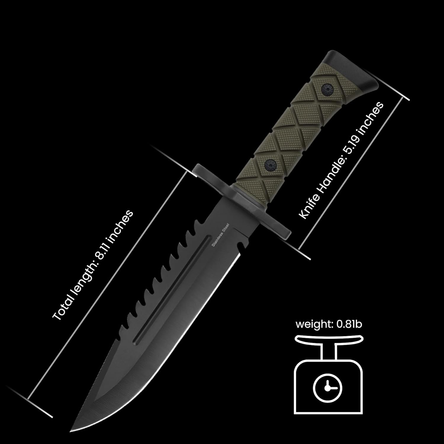 - Fixed Blade Knife: super sharp fighting knife, stronger than any hunting knife or bow and arrow knife. Total length: 14.5 inches; Blade length: 8.11 inches; Handle length: 5.19 inches; Weight: 0.8 lb. It is equipped with a high-strength PP material sheath, which is easy to carry.