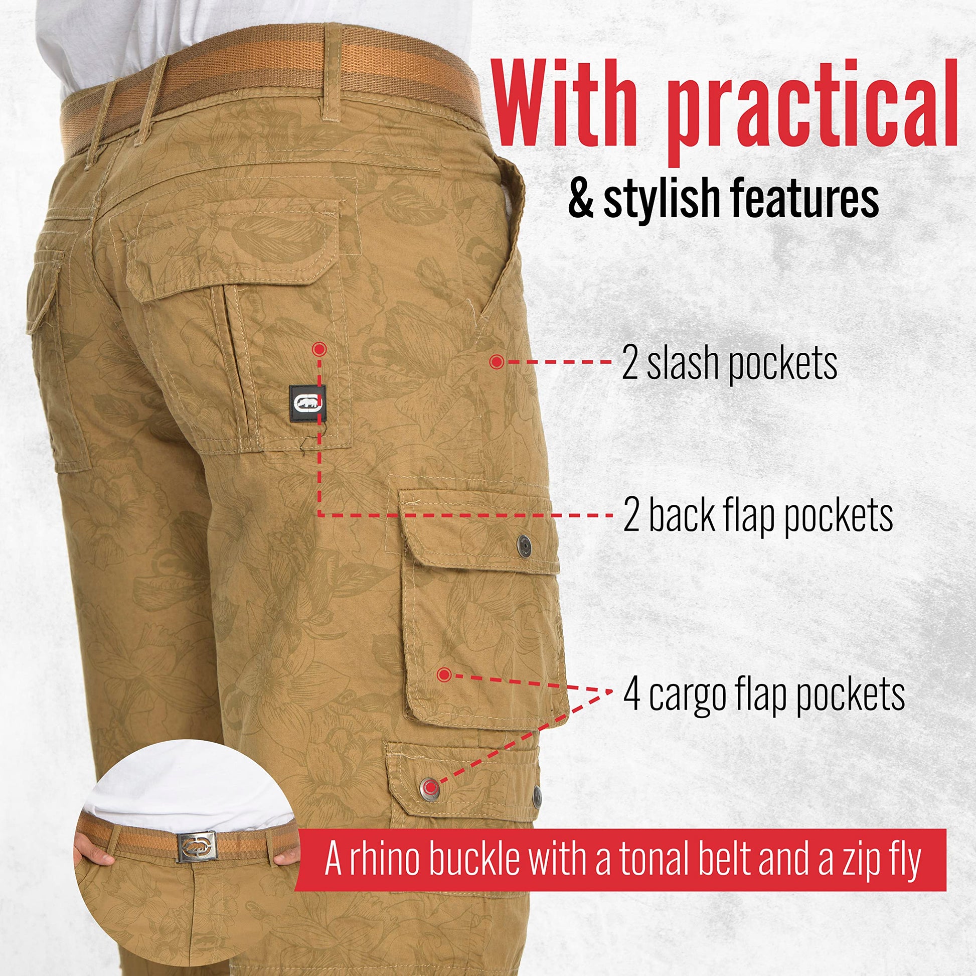 - FEATURES: This mens work shorts are equipped with 4 cargo flap pockets, 2 back flap pockets, 2 slash pockets, a rhino buckle with a tonal belt and zip fly w/ button closure. The best feature of all is that it fits most of your regular activities.