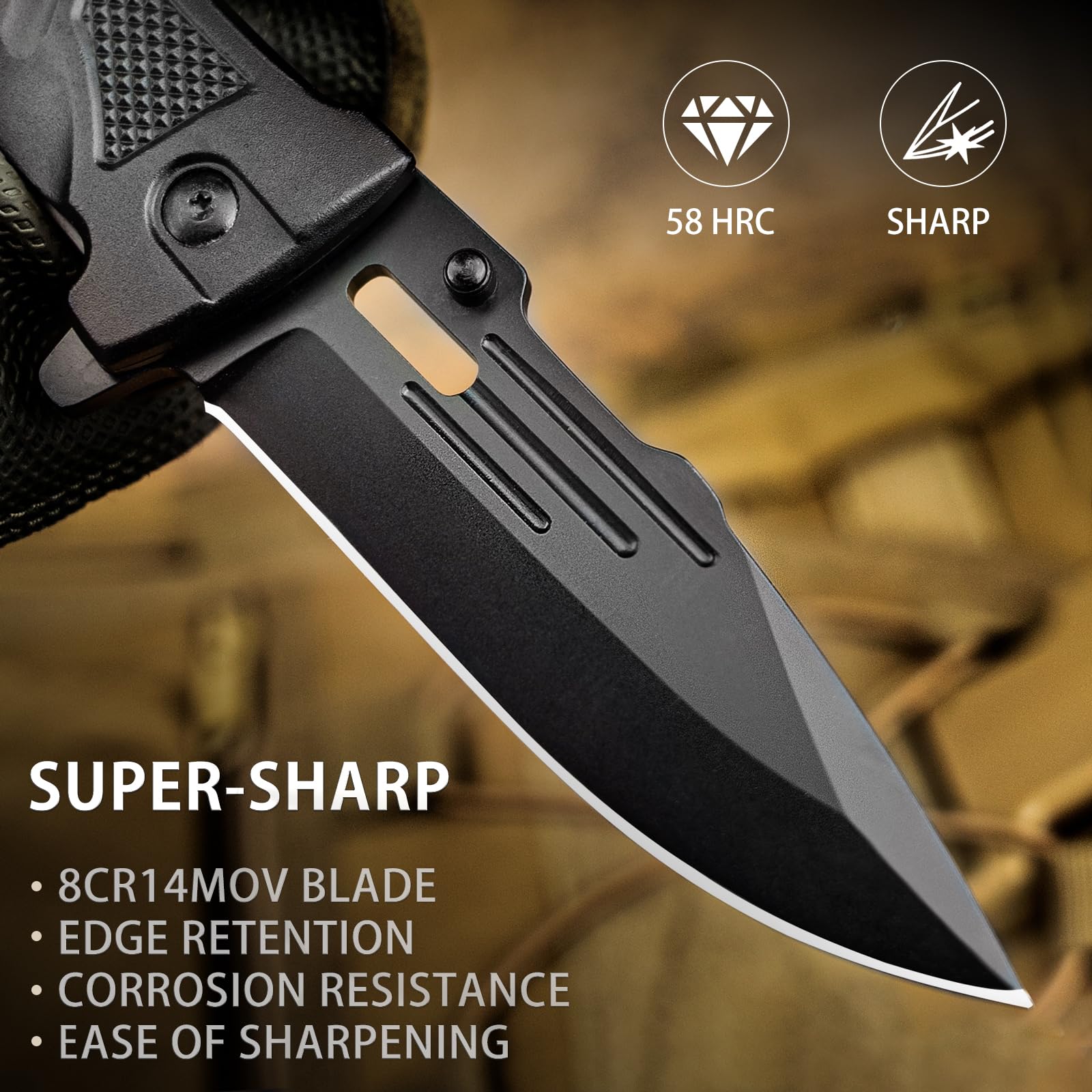 - HIGH QUALITY MATERIALS POCKET KNIFE: 8Cr14Mov with excellent cutting performance and corrosion resistance, very sharp and strong. Beautiful a drop point and black oxide coated blade design, is a comfortable and carefully designed folding knife