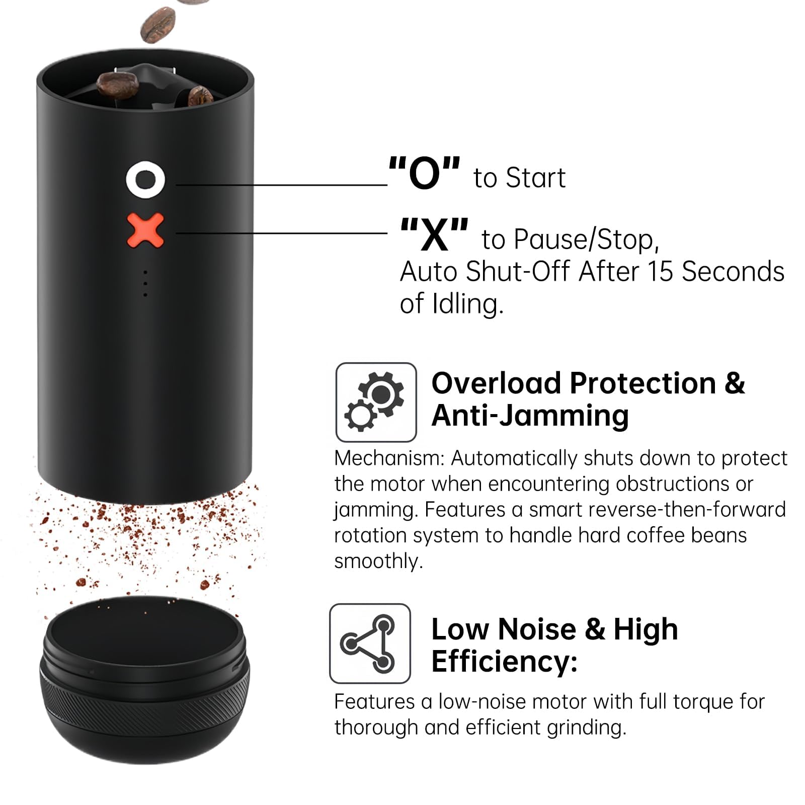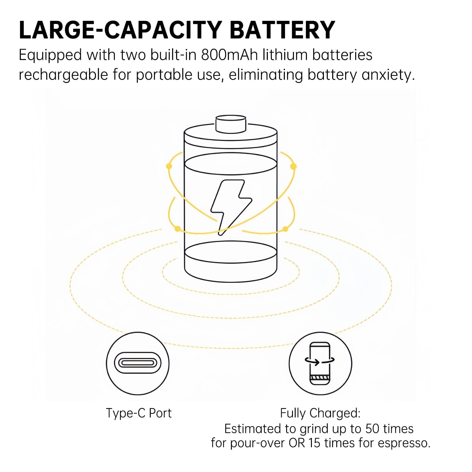 - [Extended Battery Life with Smart Energy Efficiency] - Powered by 800mAh lithium batteries, a single charge delivers up to 30-50 grinds for pour-over or 15 grinds for espresso. The smart 15-second auto shut-off not only saves energy but also ensures you enjoy fresh coffee with minimal waste.OX grinder features a replaceable battery, with a spare battery launching soon.