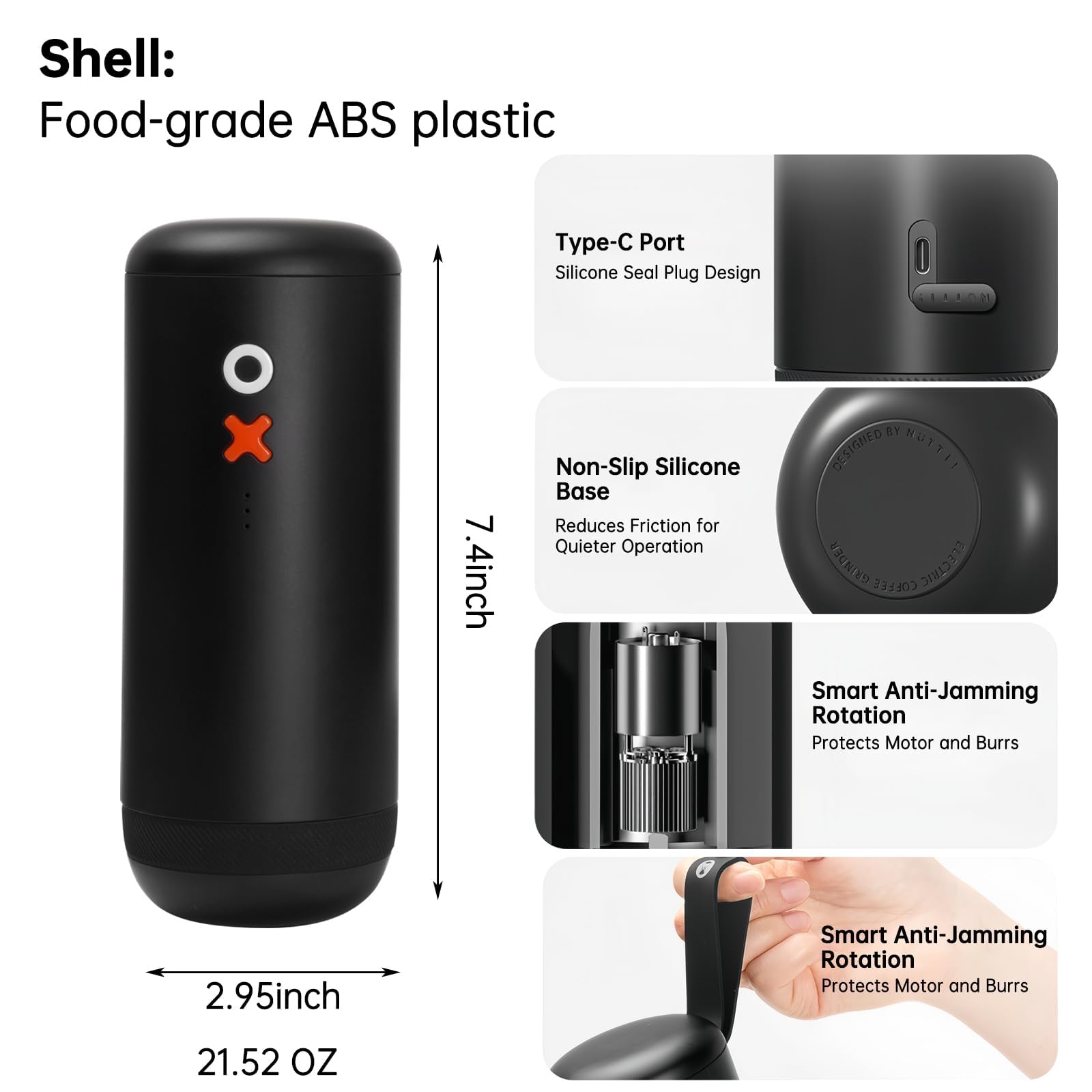 •Nuttii Burr Coffee Grinder – Electric, Portable, Small, Quiet Adjustable Conical Burr Coffee Bean Mill, 20 Grind Settings for Espresso, Pour-Over, French Press Moka, for Home Travel Use (Matte Black)
