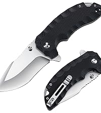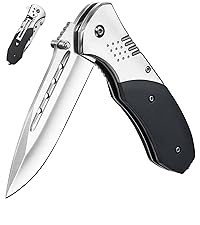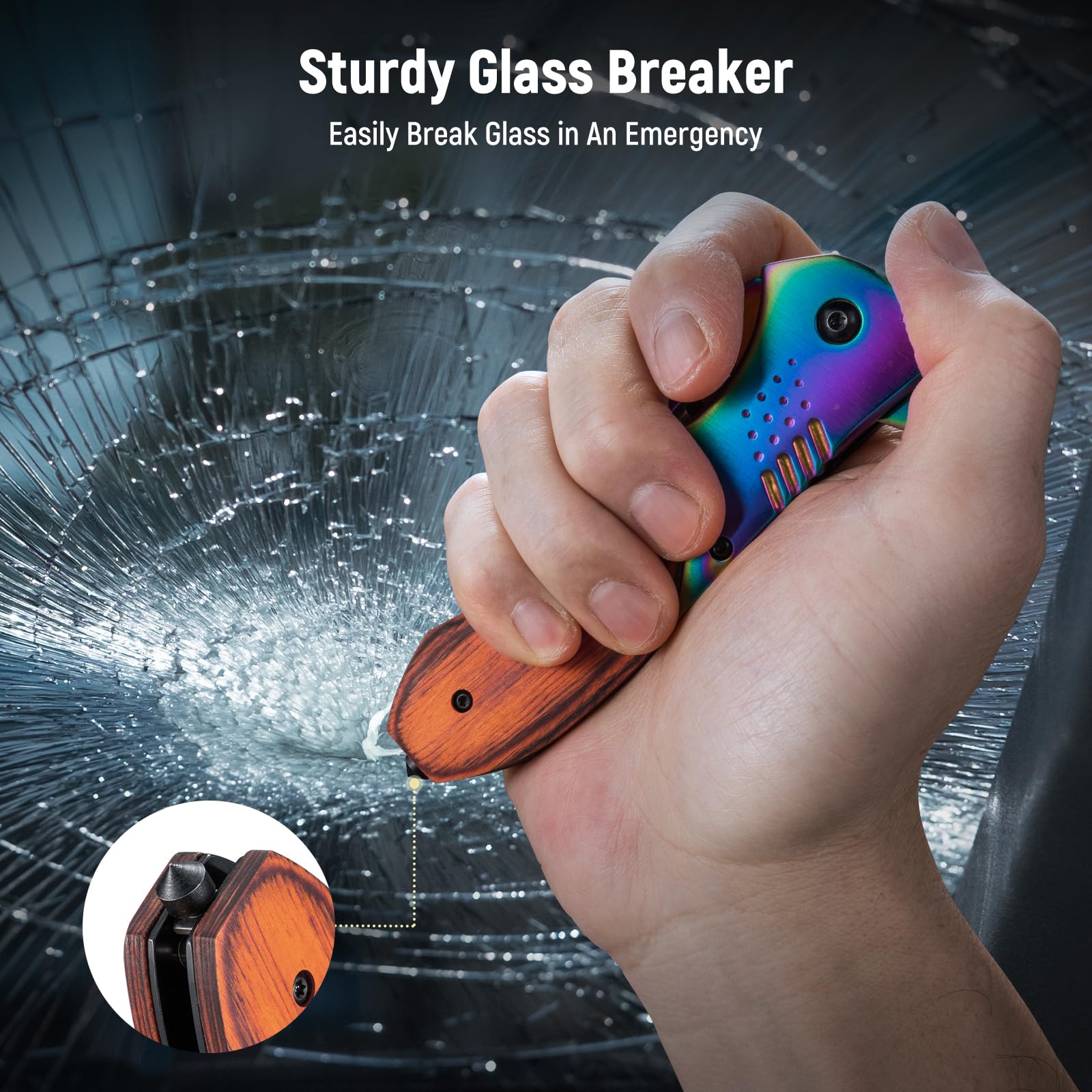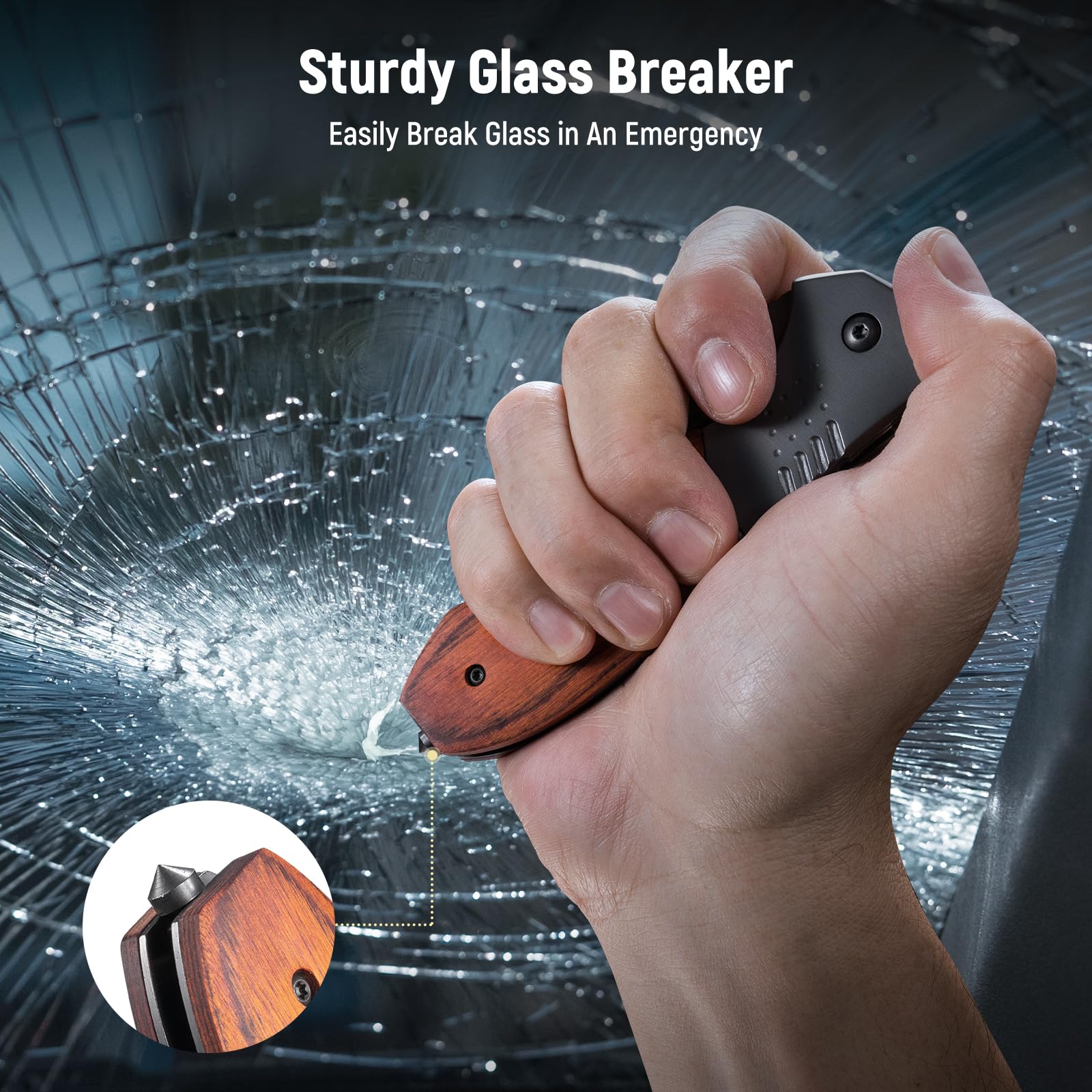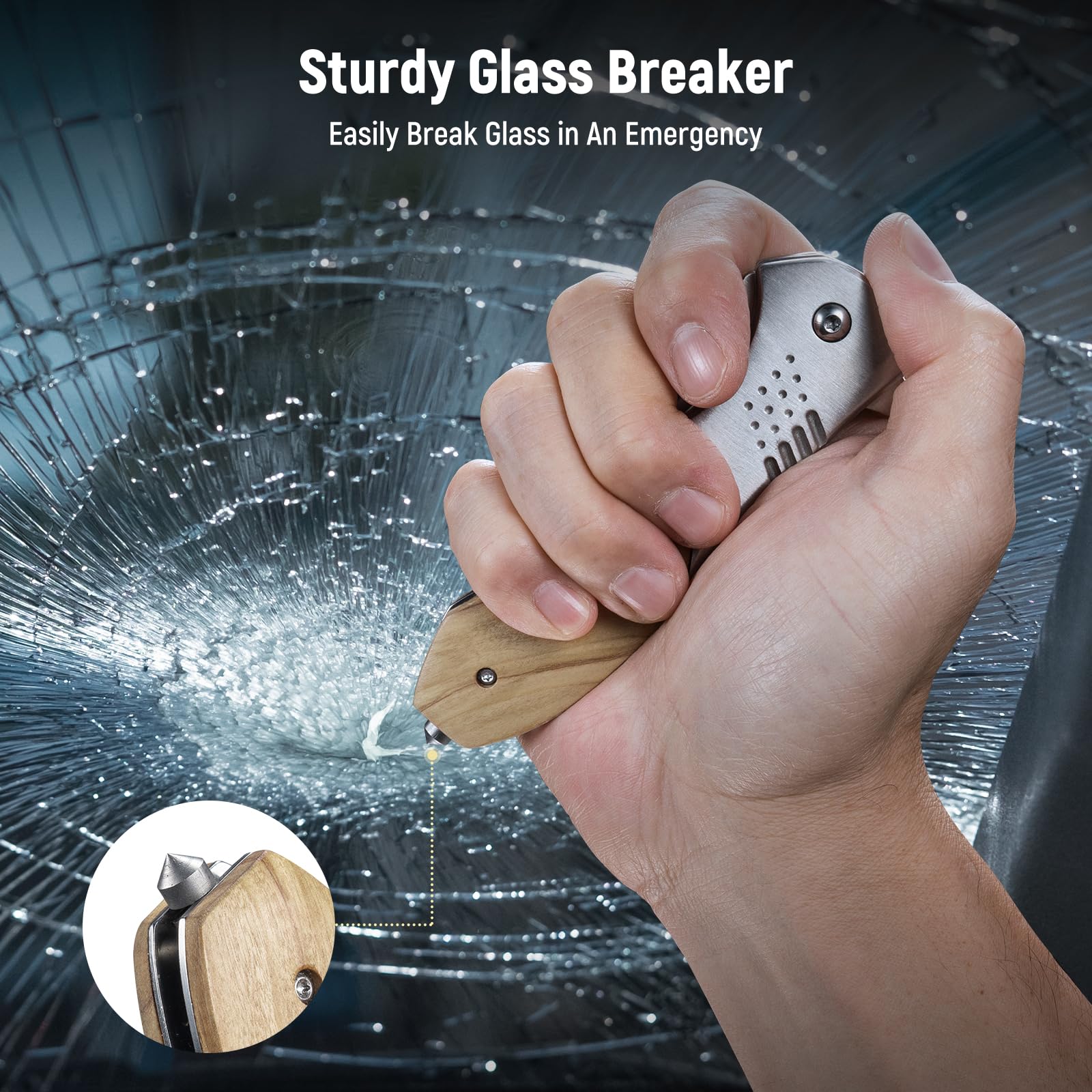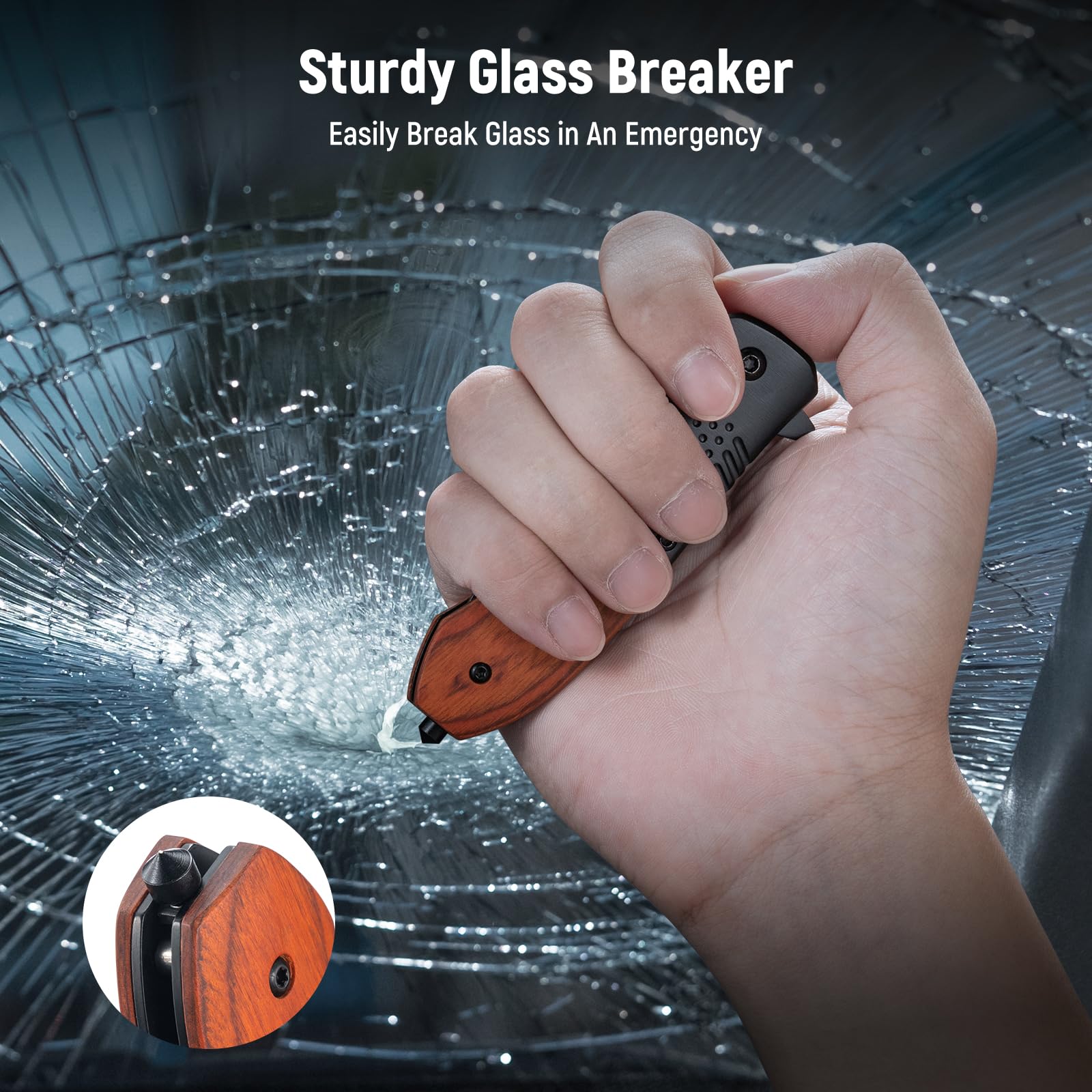 - Designed with Utility: Well-designed with a simple finger flipper, ambidextrous thumb stud, and reliable liner lock, the knife ensures effortless one-handed opening and is equipped with a glass breaker for various emergency escapes