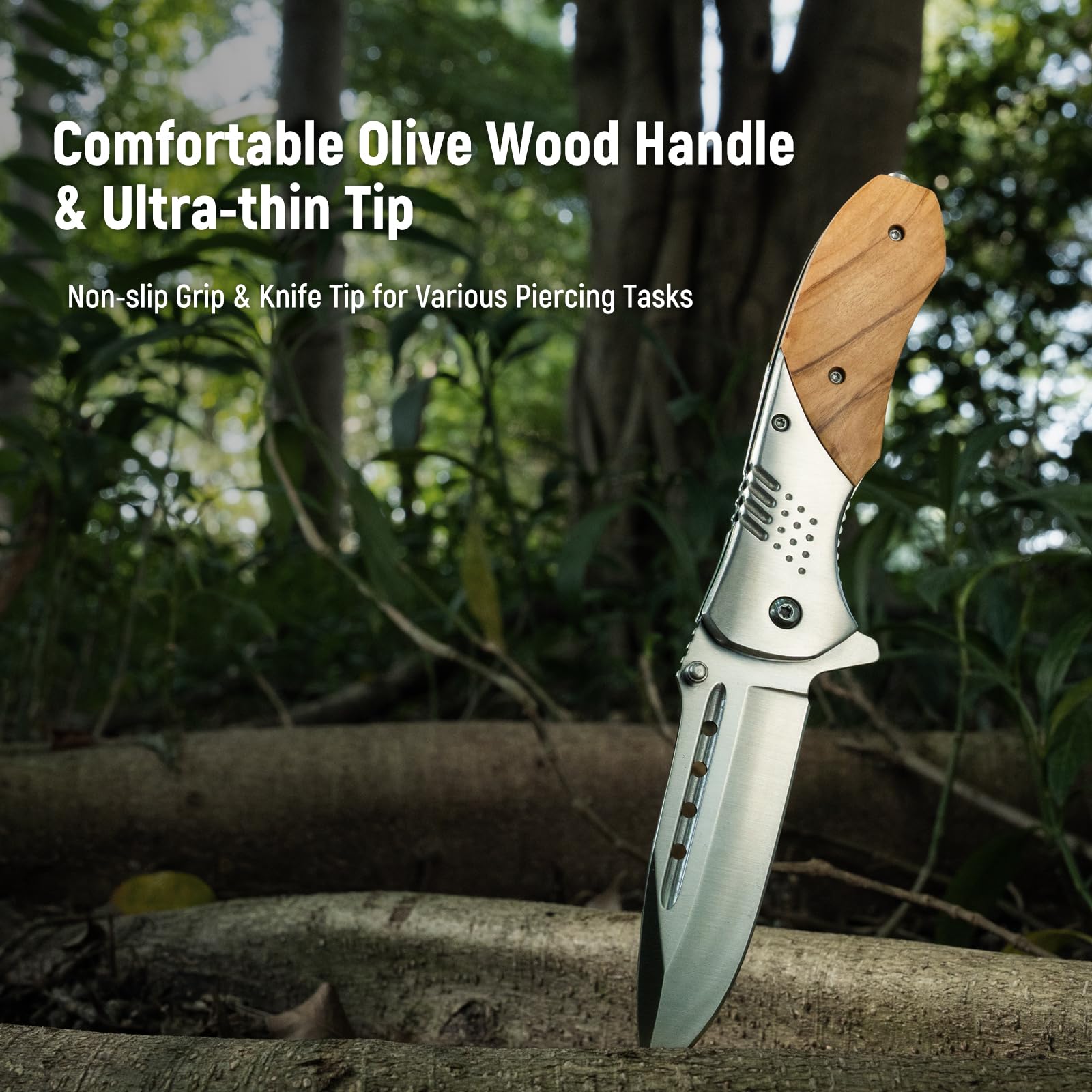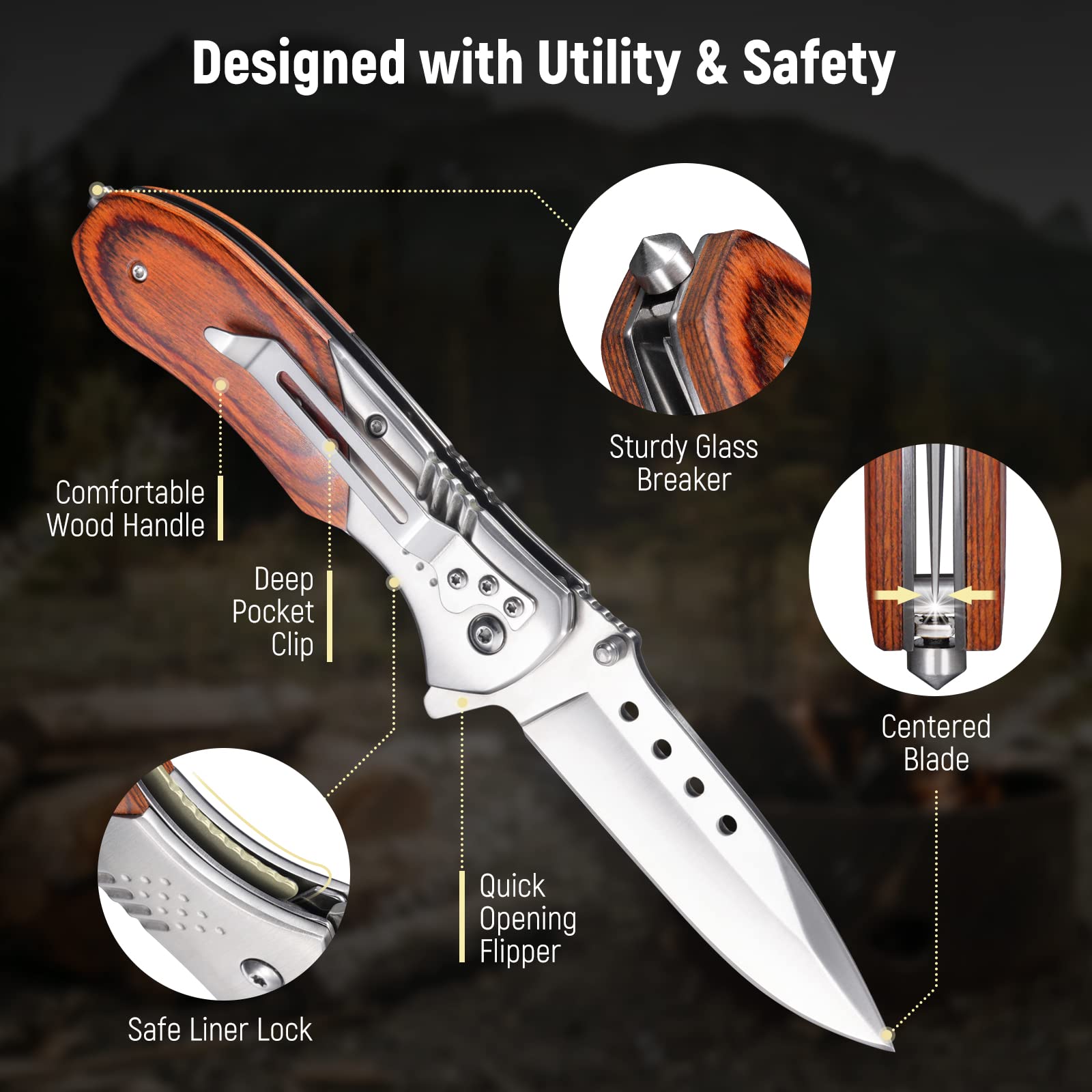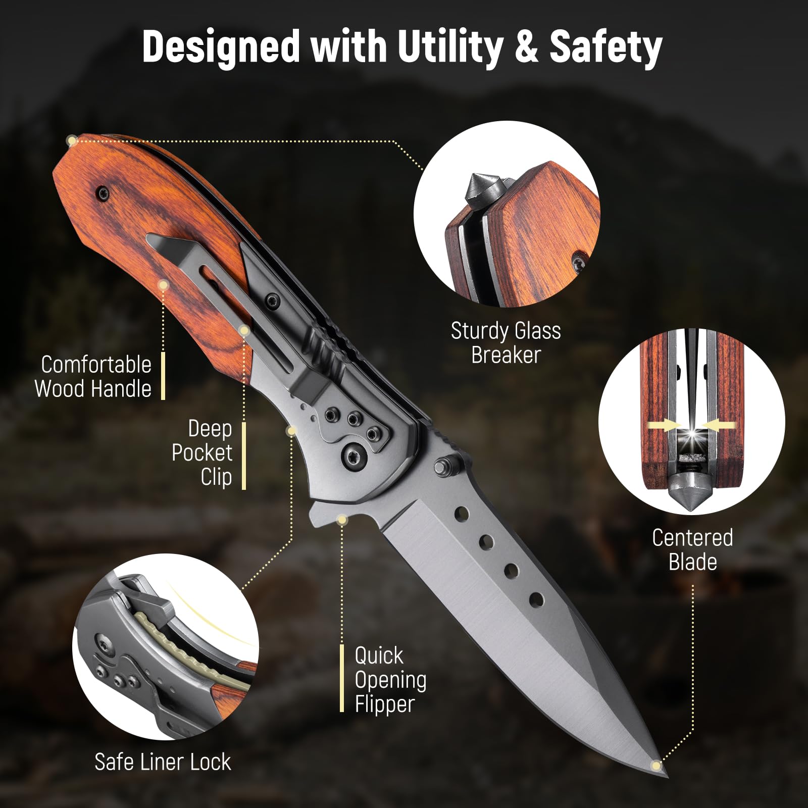 - Wood Handle Pocket Knife: This camping survival knife for men tactical comes with a handle that features vintage rosewood and finger indentions for a comfortable, secure, and solid grip when in use