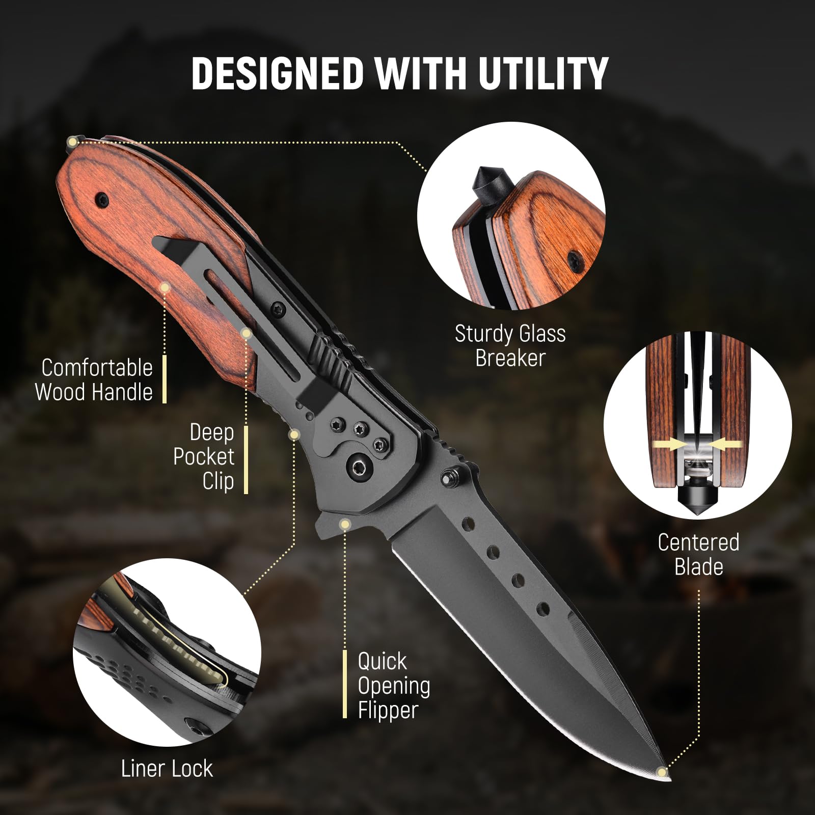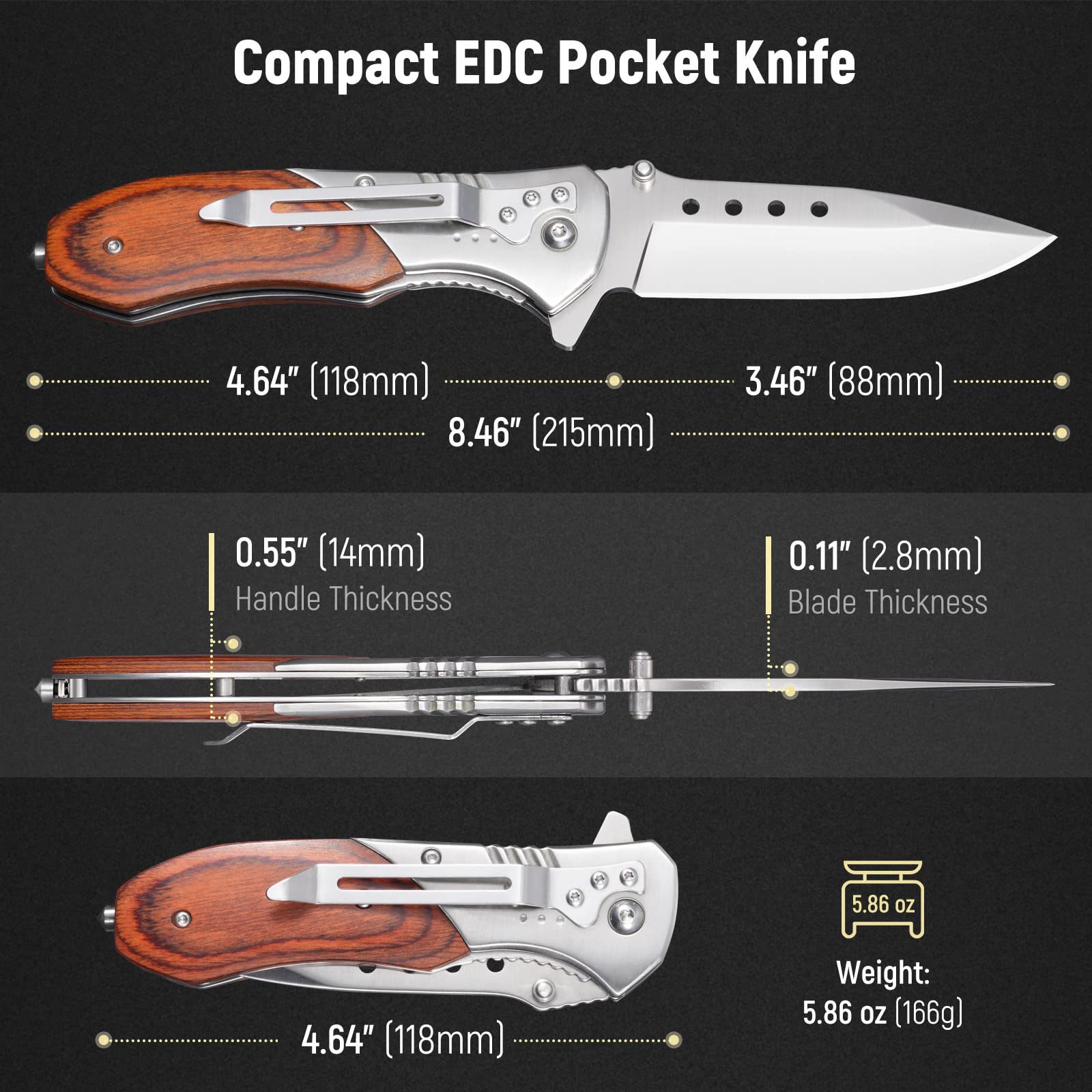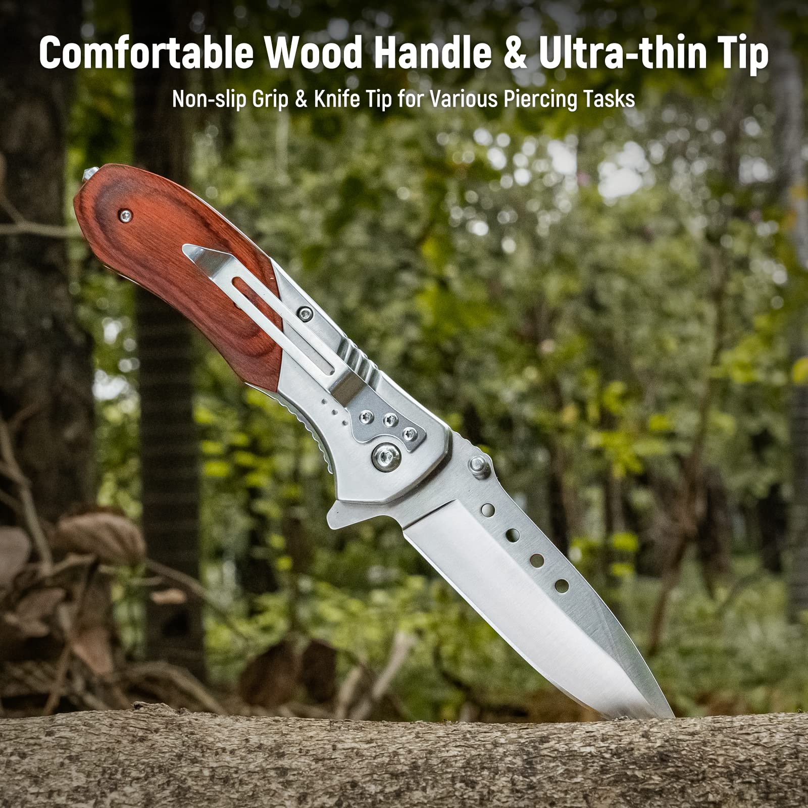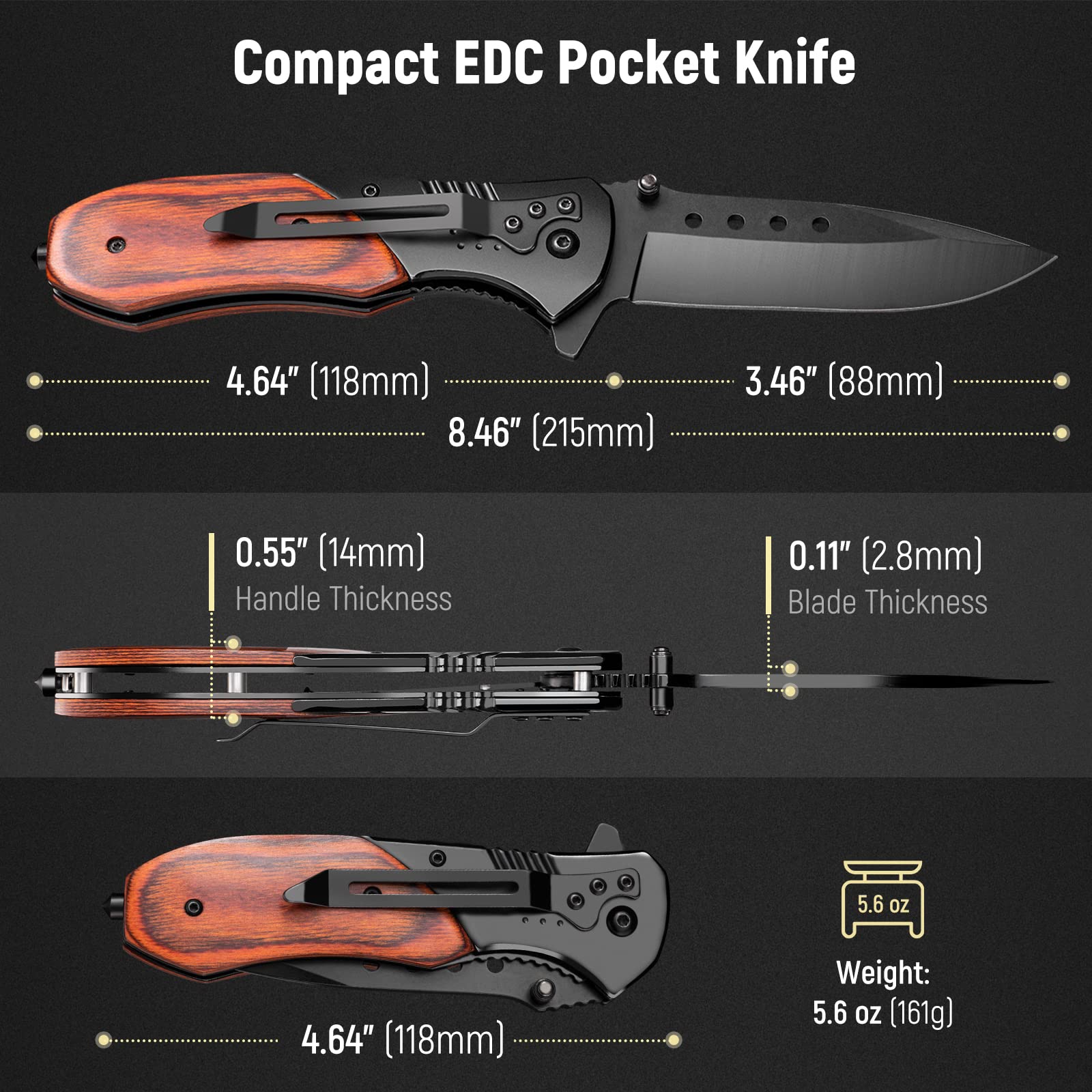 - Ultra Sharp and Sturdy: Made with sharp black 3Cr13 steel blade, this wood handle pocket knife for men keeps the ideal balance of hardness, durability, ensuring effective operation without sharpening