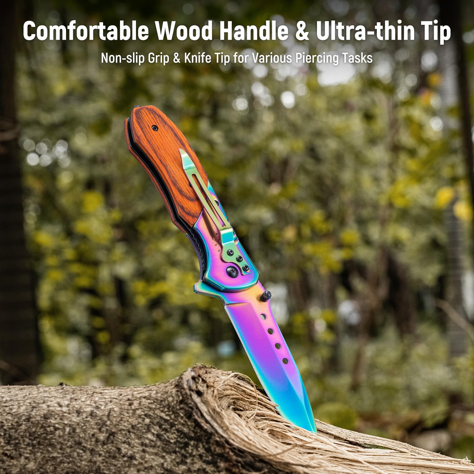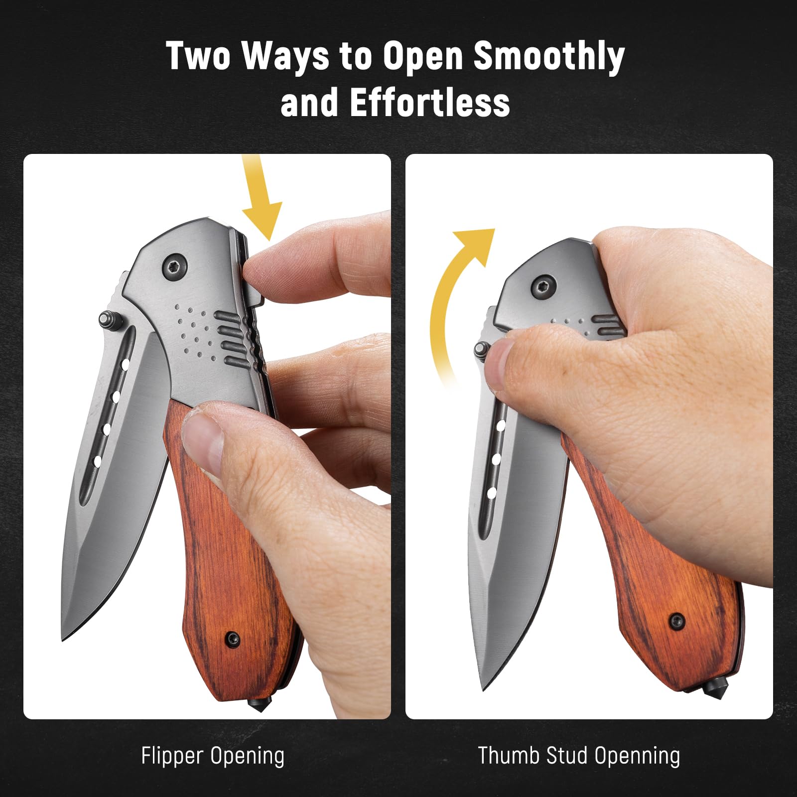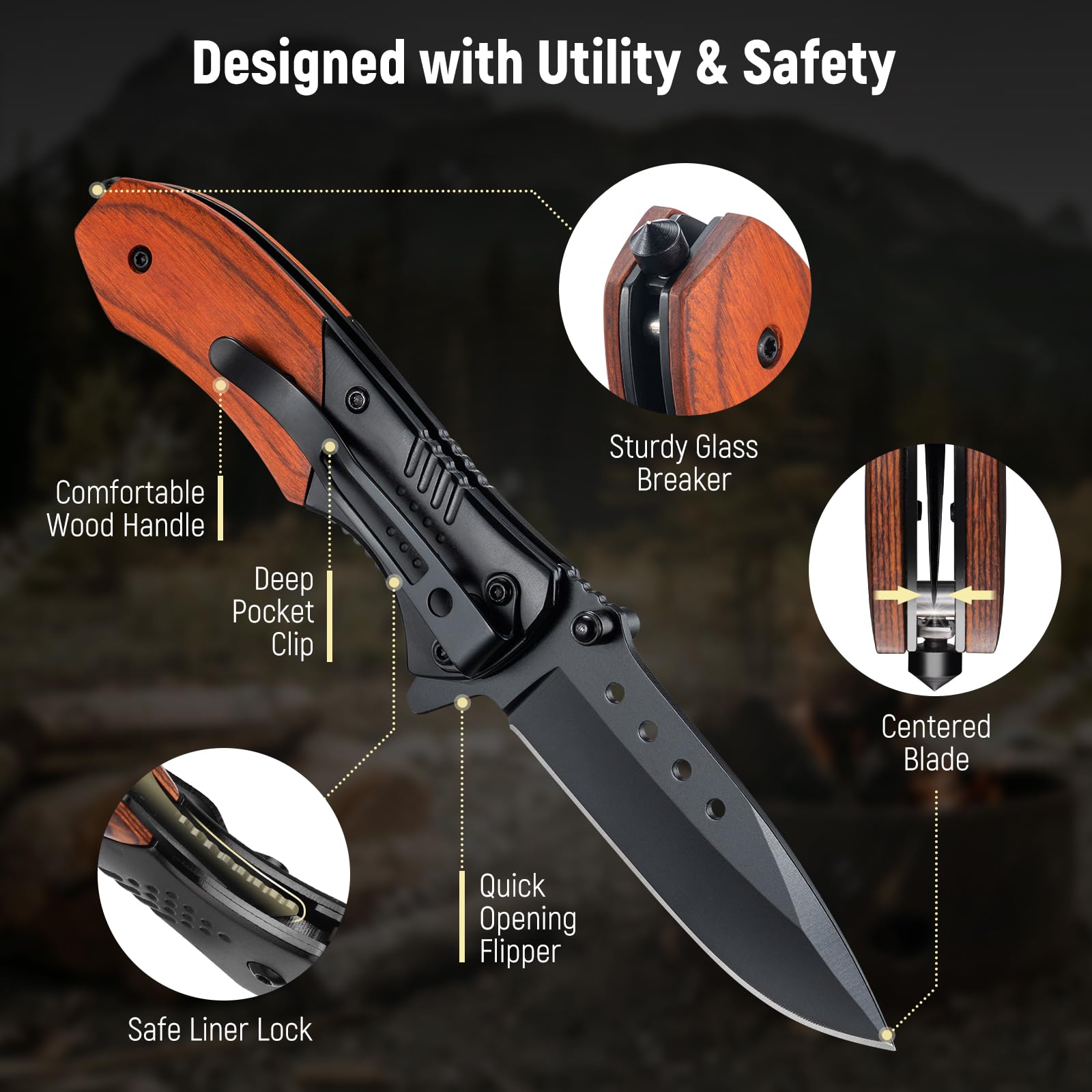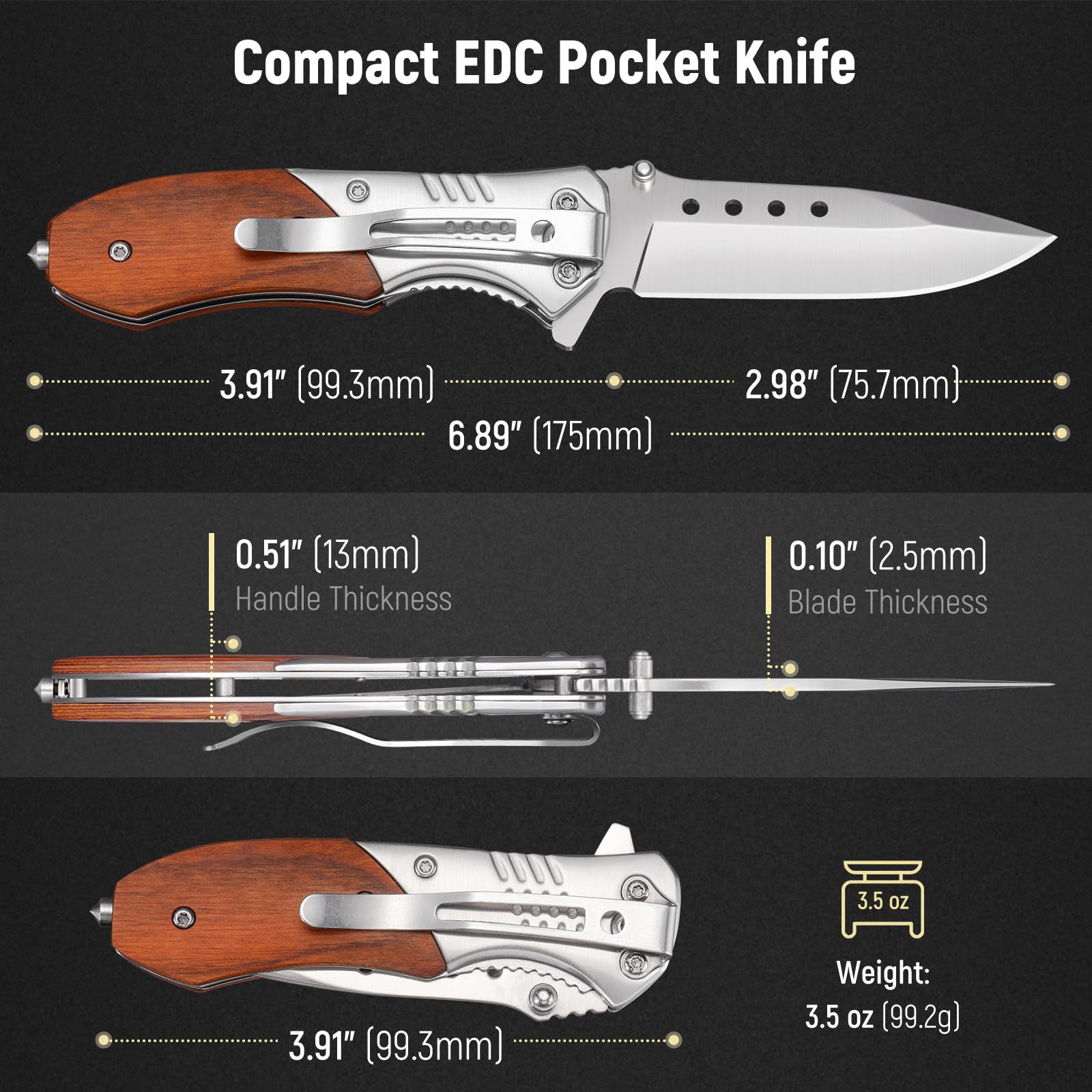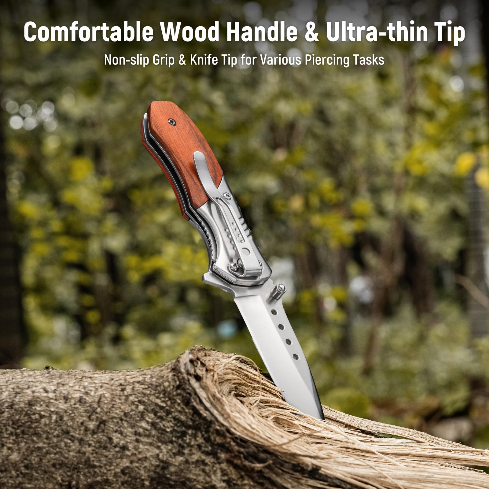 - Ultra Sharp and Sturdy: Made with sharp black 3Cr13 steel blade, this wood handle pocket knife for men keeps the ideal balance of hardness, durability, ensuring effective operation without sharpening