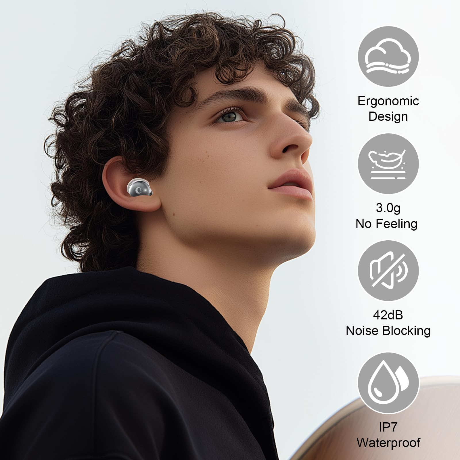 - Ergonomic Design: These mini sleep wireless earbuds feature a polished, contoured shape that fits snugly in your ear, ensuring comfortable wear and without pressure, even for side sleepers. Earbuds in-ear headphones weighing just 3.0g, they're feather-light, and the compact and sleek charging case is pocket-friendly for on-the-go convenience. With a unique sleep mode that you won't hear low battery and headphone off notification sounds, these sleep earbuds promise a full night of peaceful sleep.